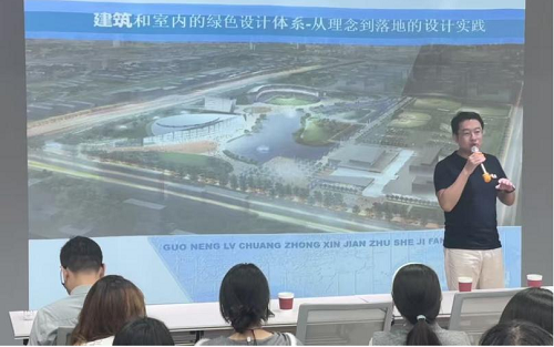 接下来,金炜雄副院长围绕绿色设计介绍了绿色理念如何转化为具体的空间策略与技术。作为国家一级注册建筑师,他从“天人合一”的传统智慧中探寻建筑与自然和谐共生的哲学基础,通过汇龙国际商贸城、深阳文化公园主题建筑等实际项目,生动阐释了绿色理念和技术在设计实践中的运用。金炜雄副院长强调,绿色设计不是技术的堆砌,而是一种空间伦理和人文关怀的体现,未来的设计师需要在文化传承与生态可持续之间找寻设计的平衡点。