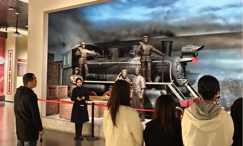 在“解放号”火车头前,同志们驻足凝望,这是中国自主设计制造的首辆客运蒸汽火车,象征着中国人民自力更生、奋发图强的精神力量。在初心广场上,由火焰、冲锋号与柱石林组成的雕塑群,以极具震撼力的艺术语言,讲述着信仰如炬、号角催征、基石永固的红色故事。